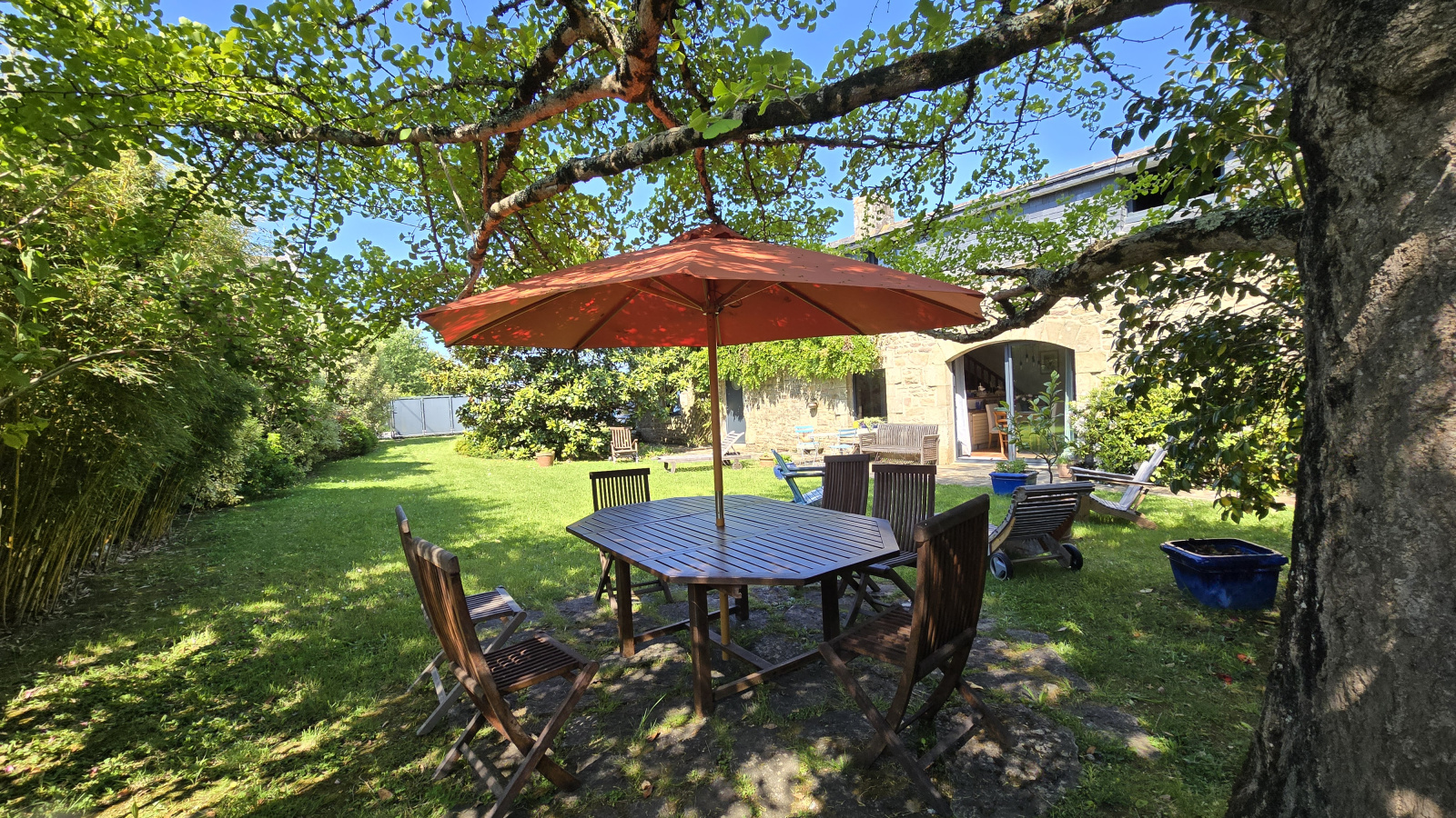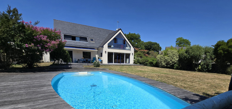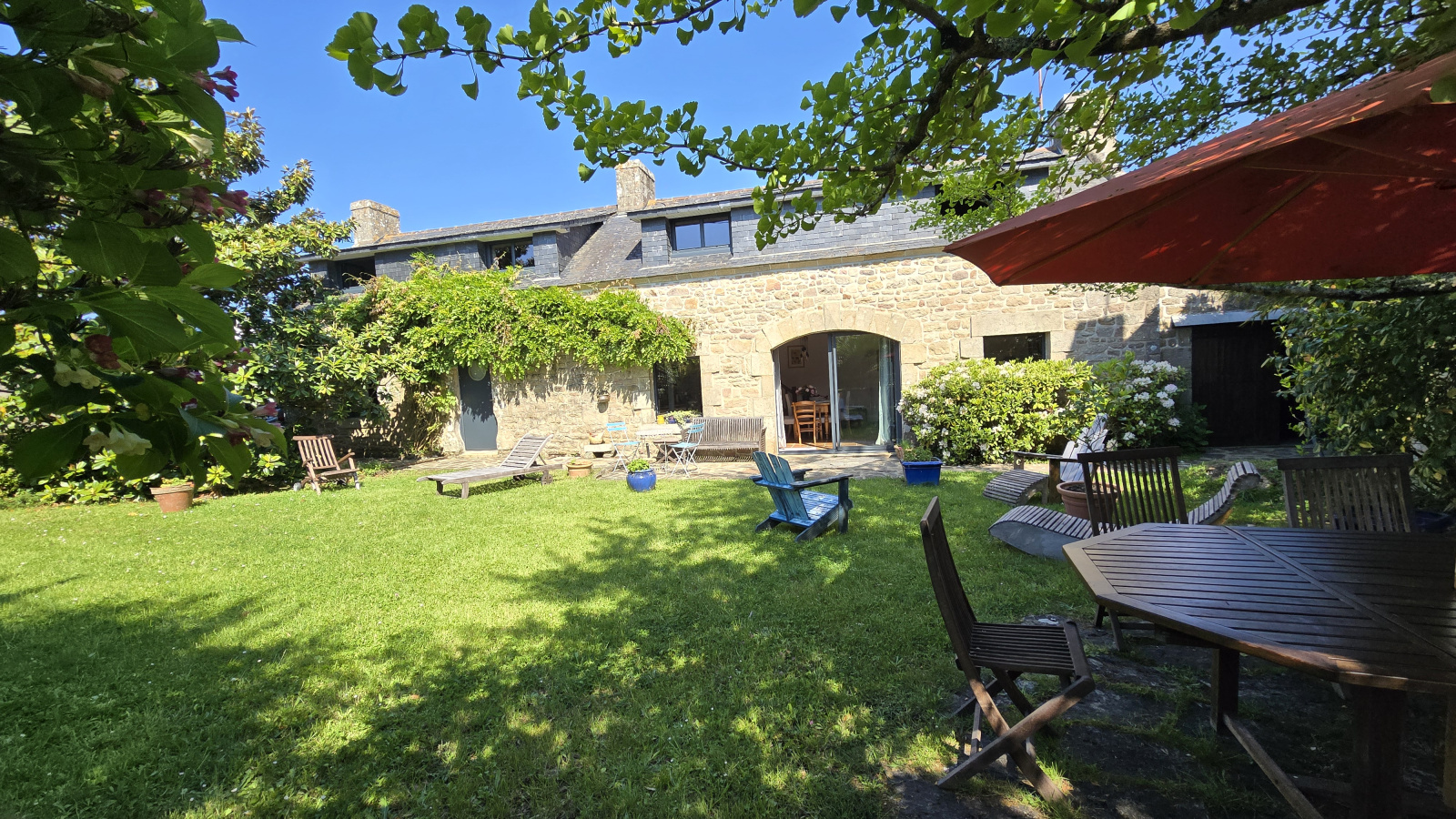 Au calme, à 800 mètres du port, superbe longère au coeur d'un jardin clos et arboré, sans vis à vis; séjour salon avec cheminée 42 m²; 4 chambres dont une en rez de chaussée. Grande remise. Parkings..