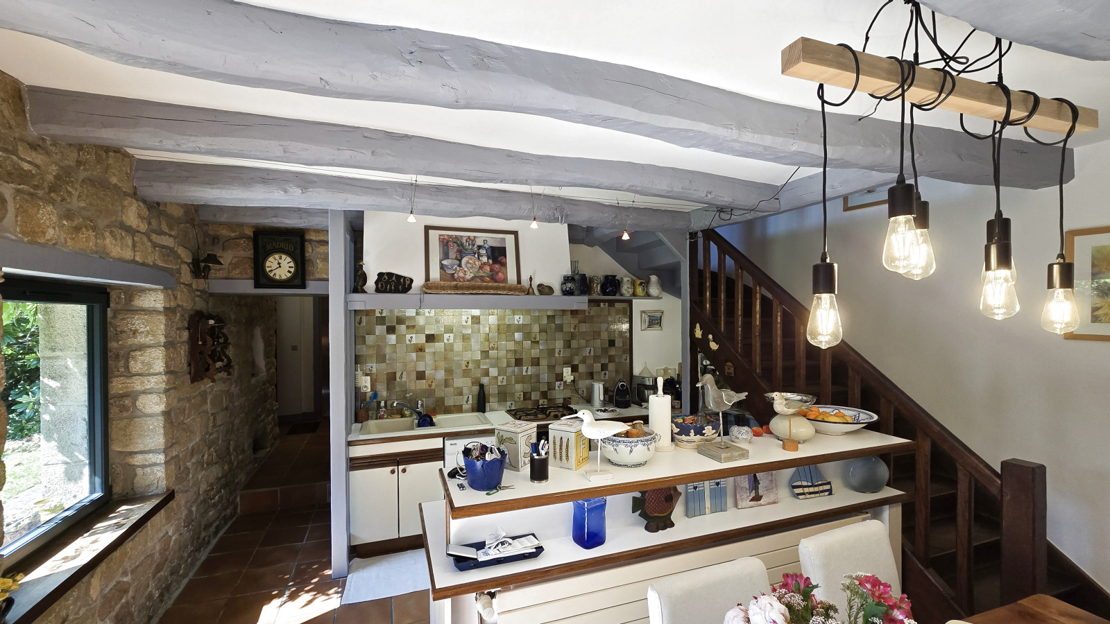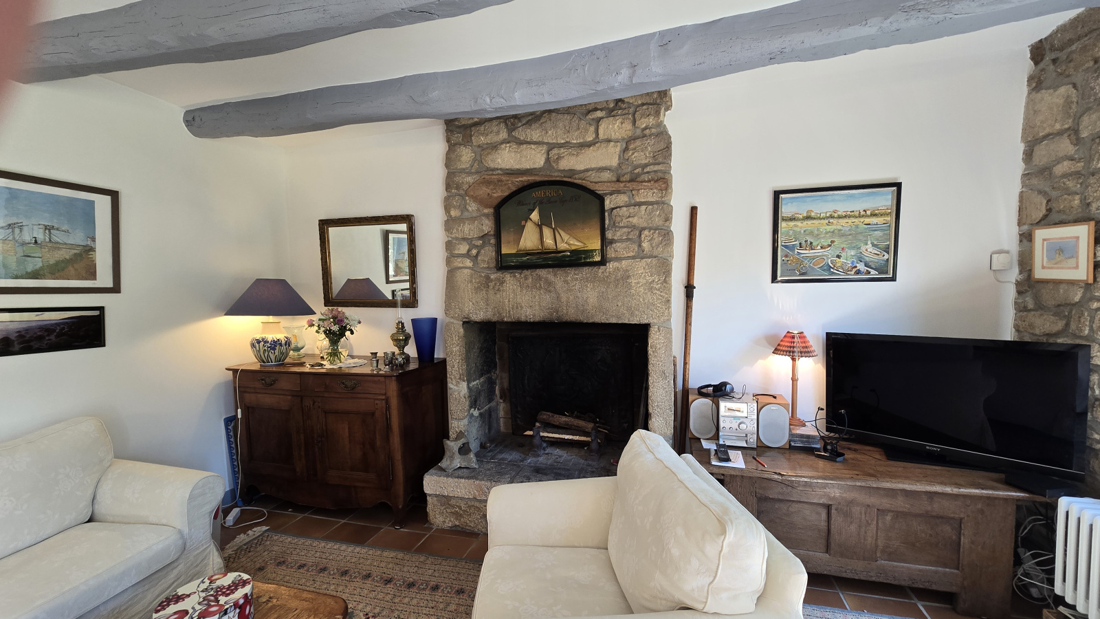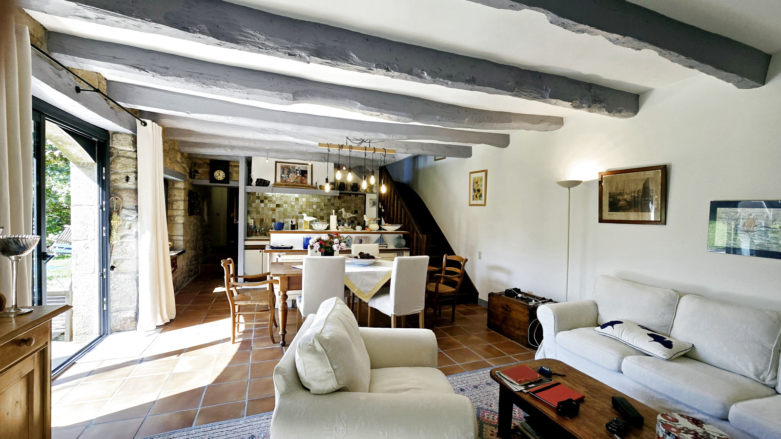 Au calme, à 800 mètres du port, superbe longère au coeur d'un jardin clos et arboré, sans vis à vis; séjour salon avec cheminée 42 m²; 4 chambres dont une en rez de chaussée. Grande remise. Parkings..